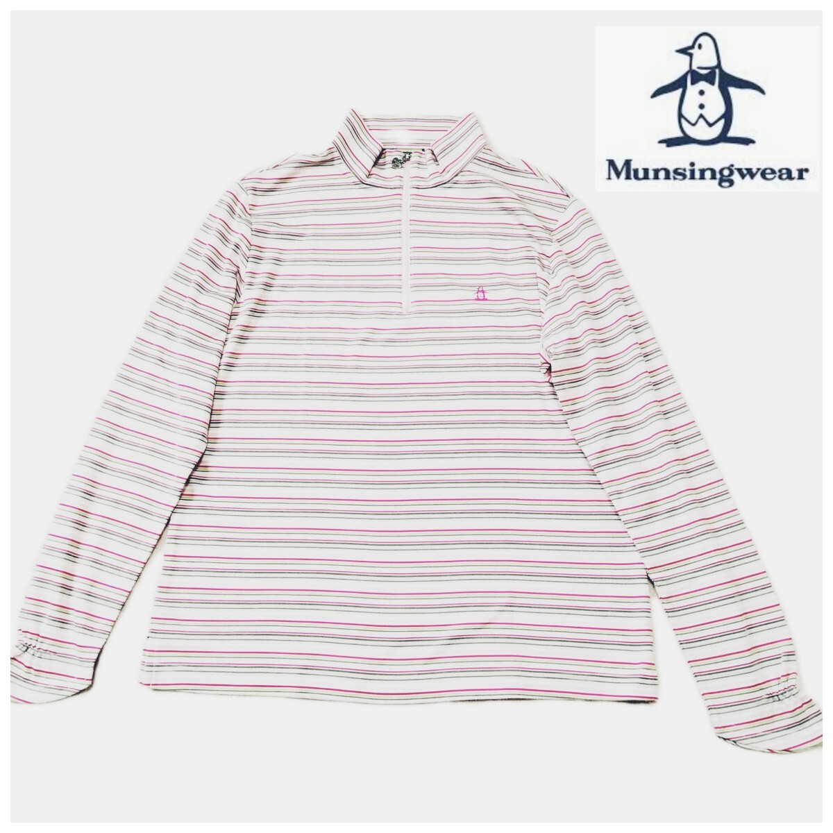 > MUNSINGWEAR マンシングウェア*大きいサイズLL*長袖Tシャツ*ペンギン*ゴルフウェア*洗える*日本製*ハーフジップ*ピンク系マルチボーダー