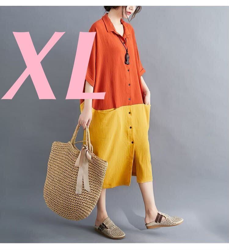 > ワンピース チュニック ロングワンピース オーバーシャツ 半袖 シャツワンピース ツートン マタニティ トレンド ストリート黄 オレンジ XL