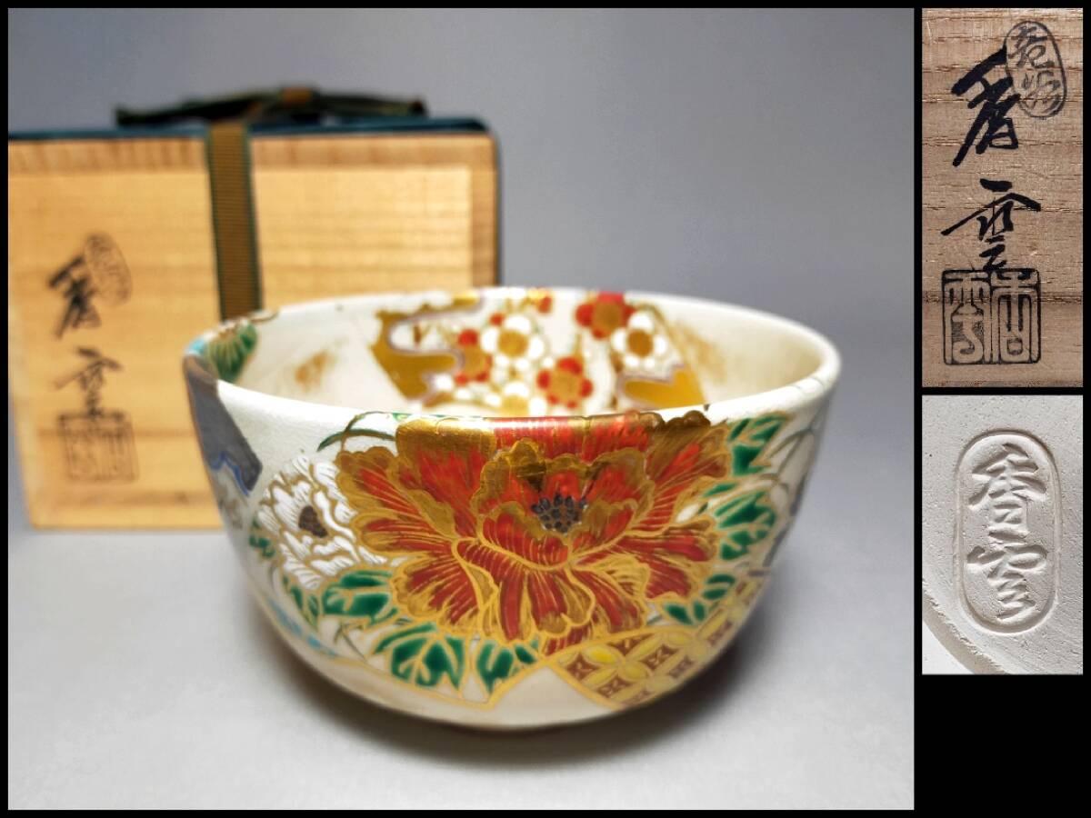- TE16 竜谷焼 茶碗 宮川香雲 造 地紙牡丹花七宝絵 共箱 茶道具
