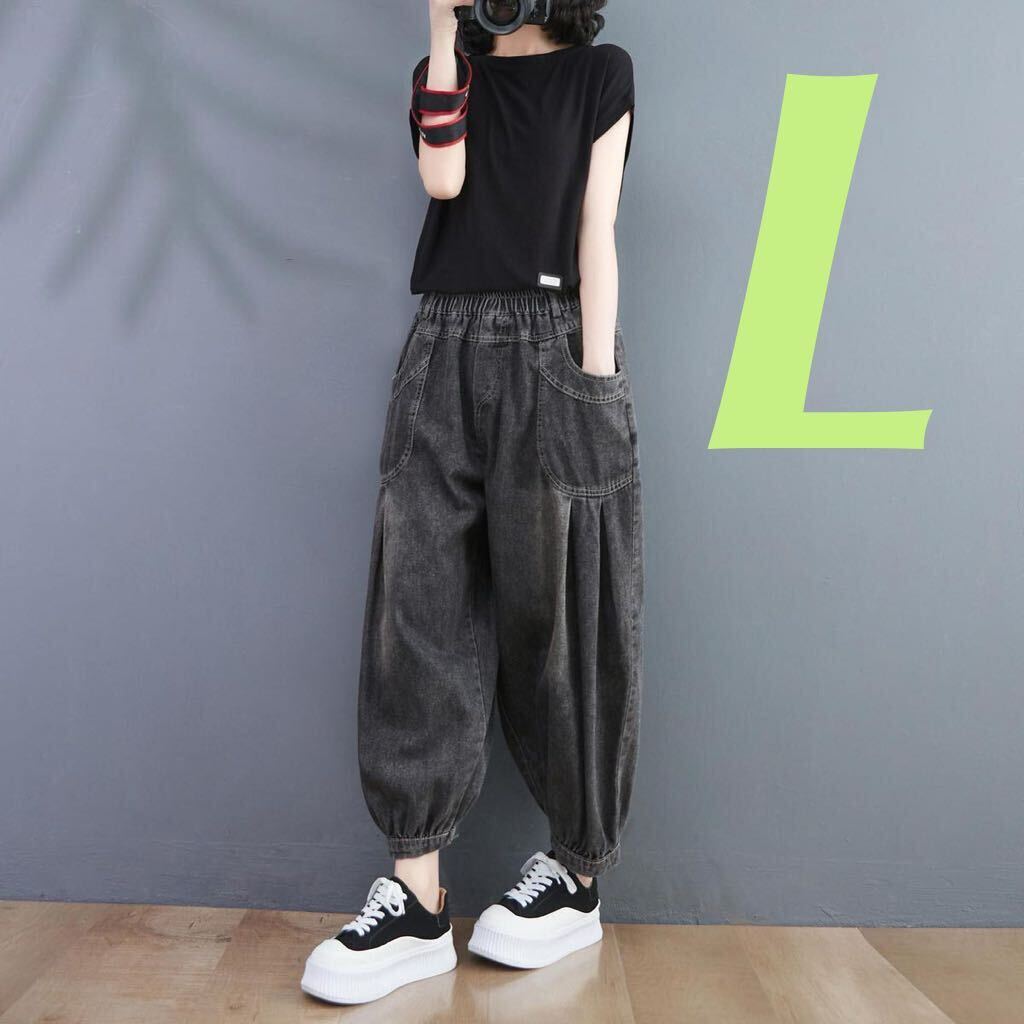 - デニム ワイドレッグ ワイドパンツ ジーンズ サルエルパンツ ワイドデニム レディース 体型カバー サルエルデニム ボトムス ブラック 黒 L