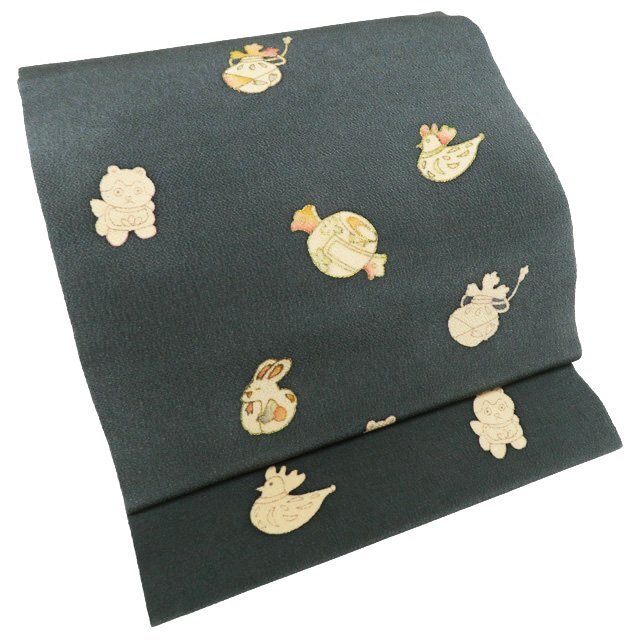 - 名古屋帯 なごや帯 中古 リサイクル 正絹 カジュアル 仕立て上がり 縮緬地 宝物の図 革色 多色 きもの北條 A1089-8