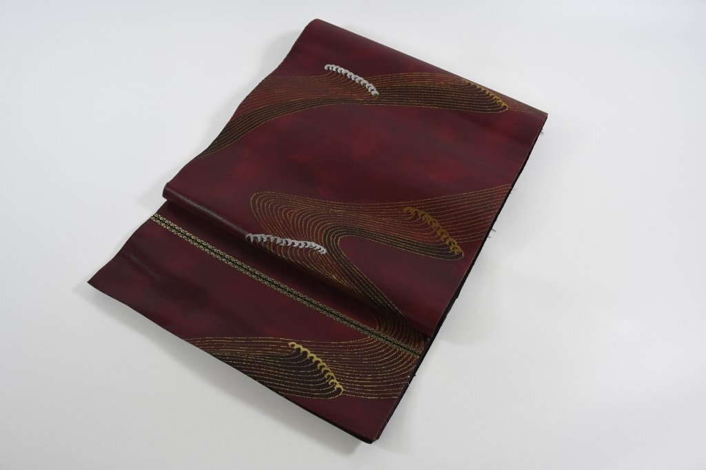 - 袋名古屋帯 波 金糸 流水 正絹 漆糸 こはく錦 服部織物 六通柄 帯丈416㎝ ★着物屋 ne-12082 桜庭呉服店
