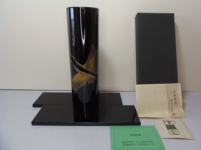 ●sk185 【丸花生】 花器 二羽鶴文様 ※難有(白い曇りシミ・板台の縁塗りムラ有)