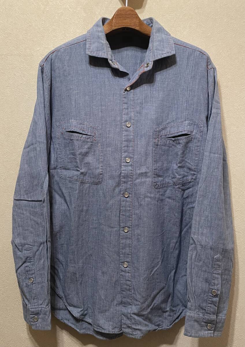 > フルスナップ80s70sビンテージ希少ウエスタン長袖シャンブレーシャツLコットン変形ヨーク切替デザイン配色ハンドステッチ80年代70年代