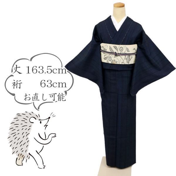 > 【お召】 長尺 『単衣』 本塩沢 【雪の中のきれ】 亀甲絣 濃淡紺色 正絹着物 TA4-7