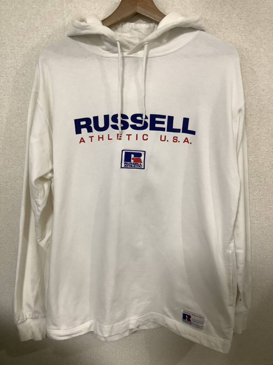 > RUSSEL ATHLETIC ラッセルアスレチック フード付き 長袖カットソー パーカー ホワイト カジュアル メンズ 古着