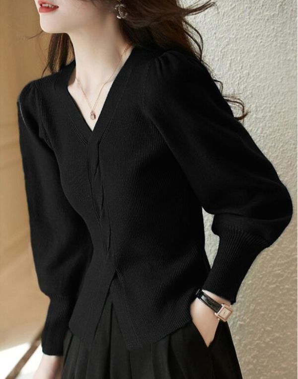 > 秋冬品*ニットトップス レディース 長袖 ニットセーター オシャレ韓国風 大人 ニットソー 通勤服 オフィス きれいめ 着やせ 上品*ブラック