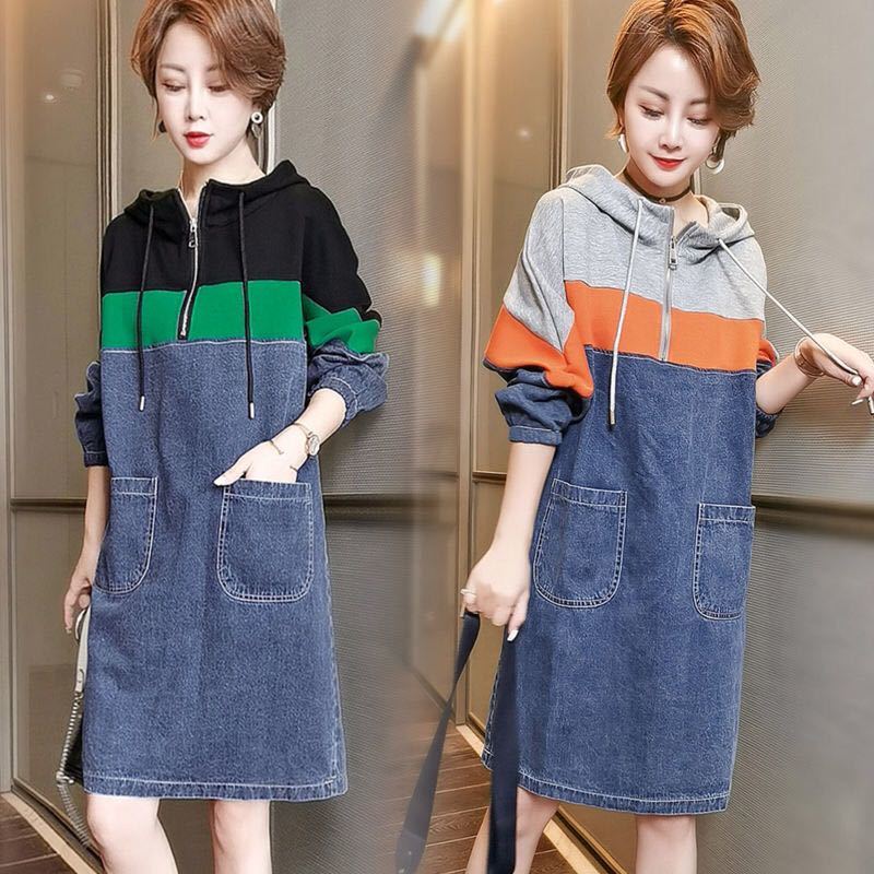 - レディース ロングワンピース デニムワンピ 春秋 ゆったり 長袖 フード付き 切替 可愛い おしゃれ LWDA089(2色M-2XL)