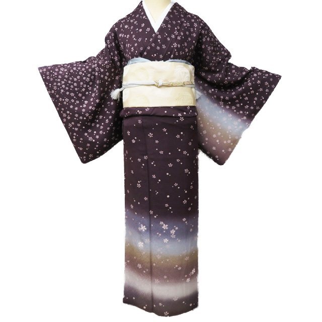 > 付け下げ 付下げ 訪問着 着物 中古 正絹 袷 フォーマル 桜模様 刺繍 暈し 焦茶色 多色 身丈164.5cm 裄67.5cm L きもの北條 A1100-10