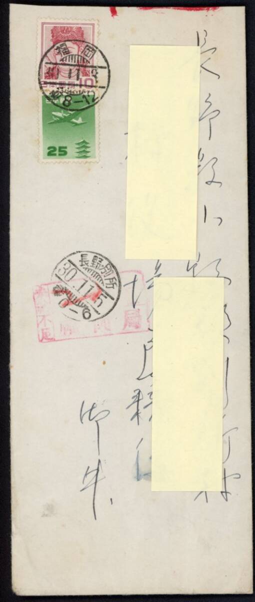- A8 エンタイヤ 10円「壁画」・25円「五重塔航空」貼 福岡/30.11.3 不足印