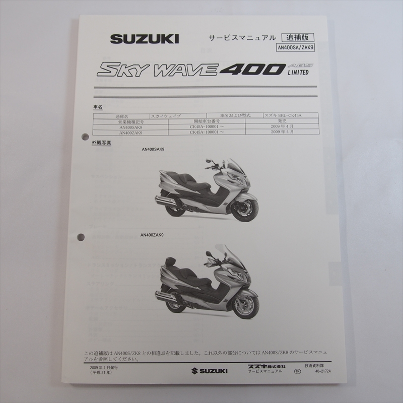 - スカイウェイブ AN400SA ZAK9 追補版サービスマニュアル スズキ CK45A 2009年4月発行 配線図あり SUZUKI