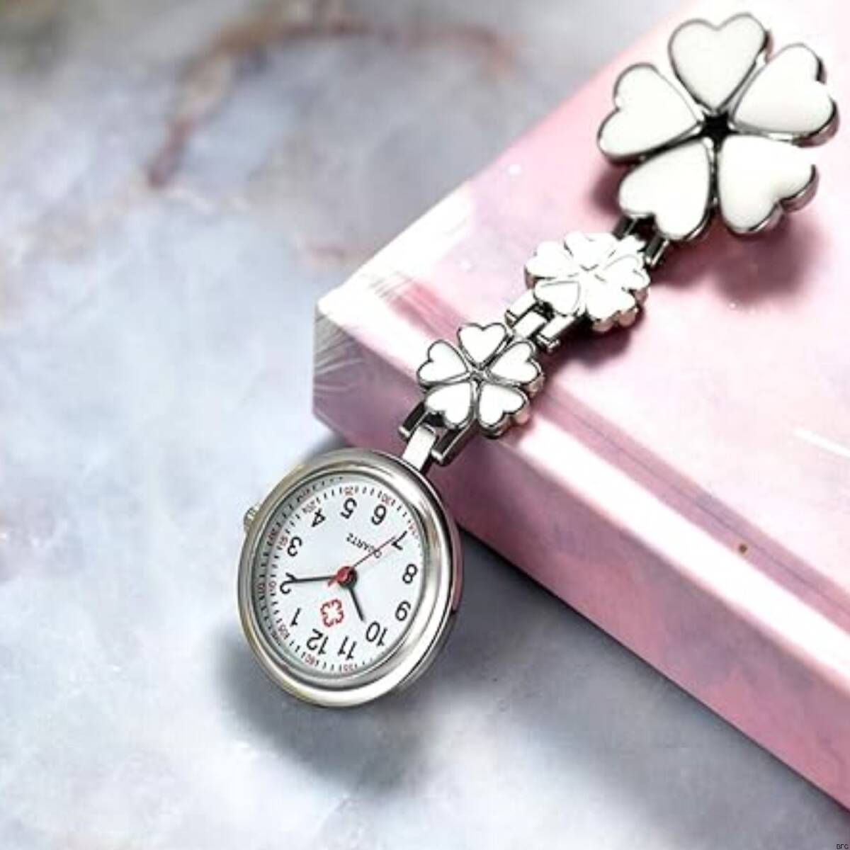 - ナースウォッチ 花びら ホワイト クリップ 時計 小型 レディース オシャレ かわいい 送料無料 シンプル アナログ 逆さ