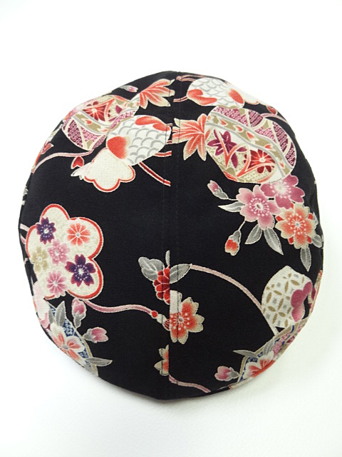 - ビンテージ 古着 着物 リメイク 再構築 ドライビング ハンチング ハット キャップ 帽子 和 総柄 和柄 ちりめん 1点物 レア 珍品 黒 花 色