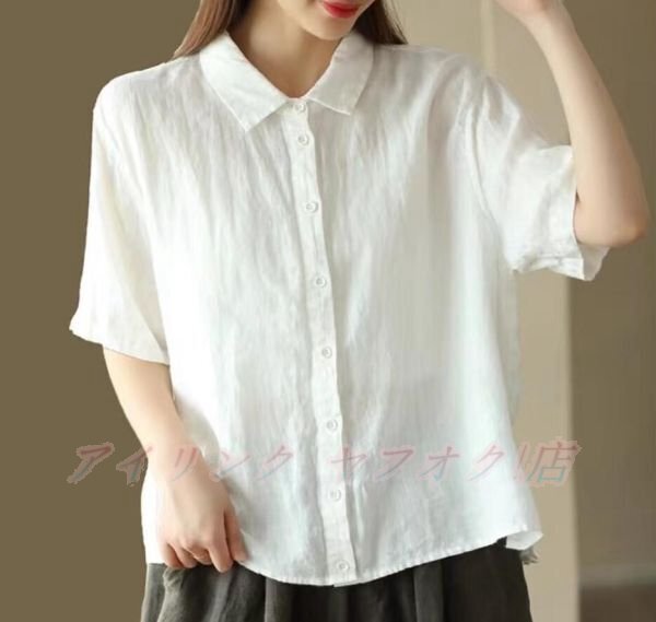 > ☆新品シャツ ブラウス レディース トップス 無地 綿麻 前開き リネンシャツ 羽織り チュニック ゆったり ホワイト