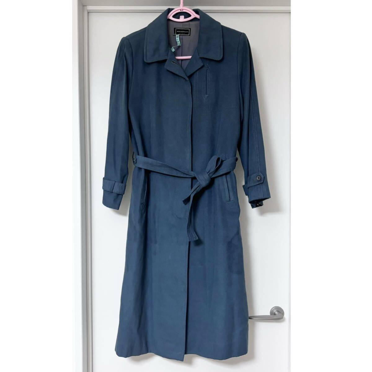 - ベルト付きスエードステンカラーコート くすみブルー 11号 スウェードチェスターコート ロングコート 青 ピーチスキン 起毛 トレンチコート