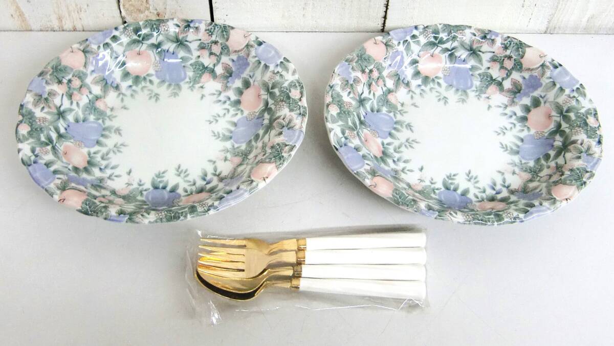 - アンティーク *Lanyo Japan *カレーシチューセット *皿 器 プレート 2点まとめ *スプーン フォーク付き *フルーツ柄 *テーブルウェア