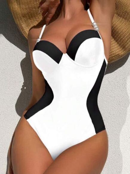 - パール 白 黒 ワンピース 水着 体型カバー オシャレ 個性派 セクシー エロい キラキラ ツートン 盛れる ハイレグ