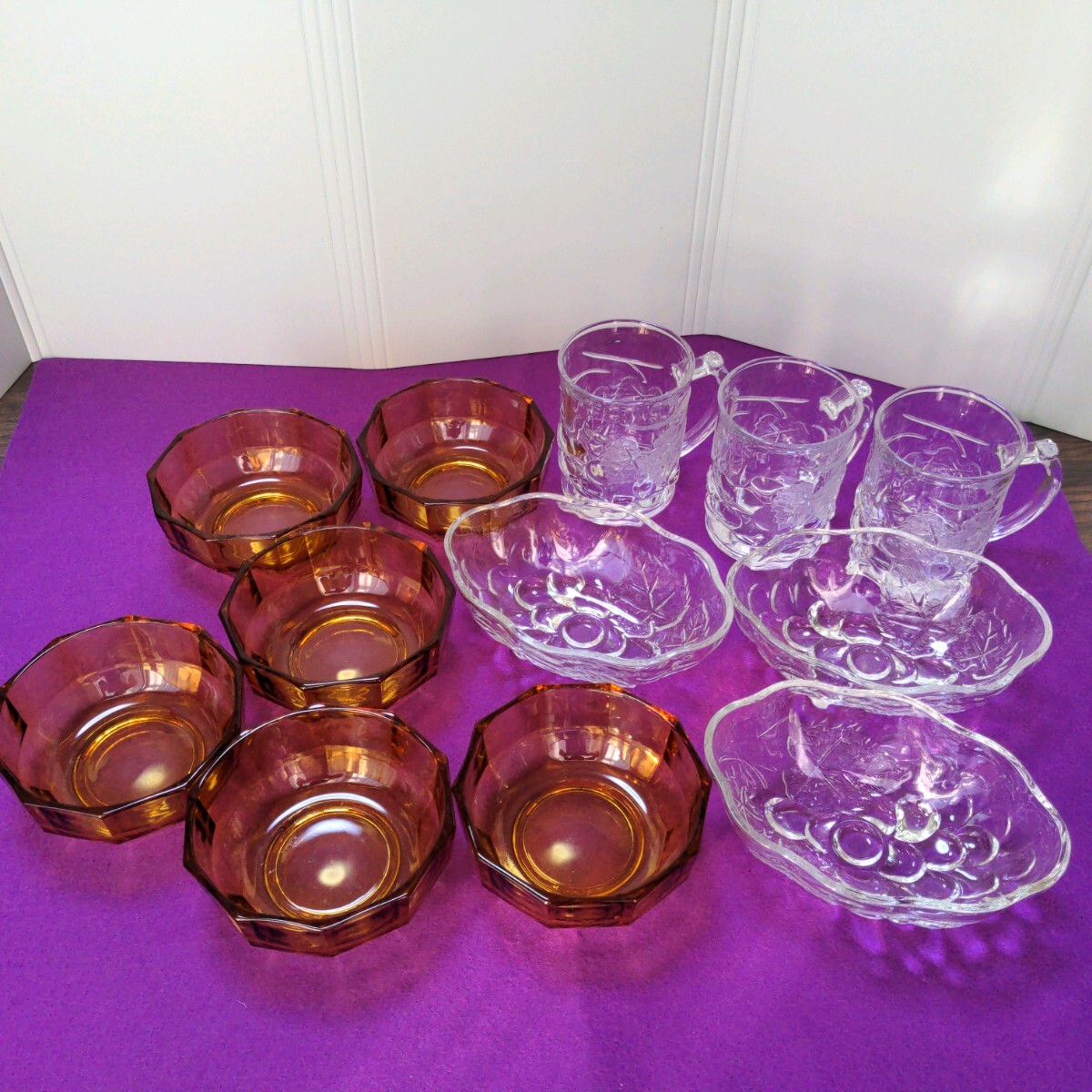 - 計12点 蘇我ガラス グレープ盛合せセット ジョッキ 楕円鉢 アンバー 八角 アンバーガラス 小鉢 ガラス小鉢 昭和レトロアンティーク 琥珀