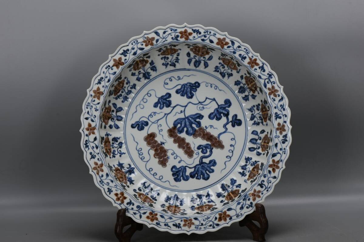 - ◆蔵出◆古美術 中国古玩元 大明永樂年製 青花 釉里紅 纏枝蓮花紋大盤 時代物 A04