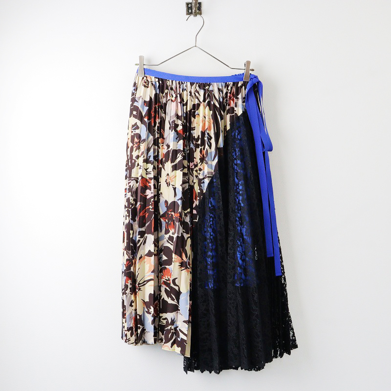 - 2021SS ロイスクレヨン Lois CRAYON レース切替 プリーツ フラワー スカート M/ベージュ ブラック ボトムス フレア【2400014127119】