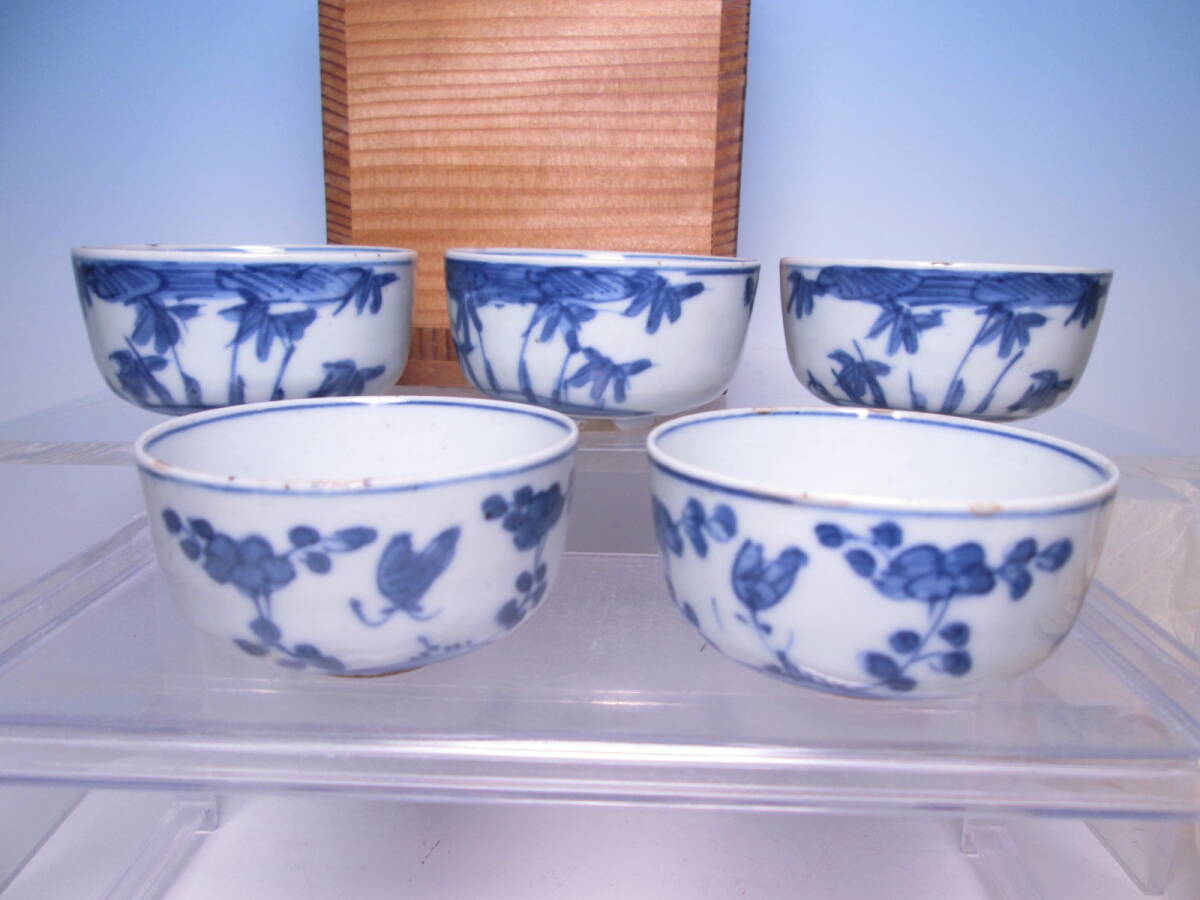 > ☆煎茶道具 中国古陶磁 古染付 花文 煎茶碗 五客 木箱付 A 中国古玩/中国美術