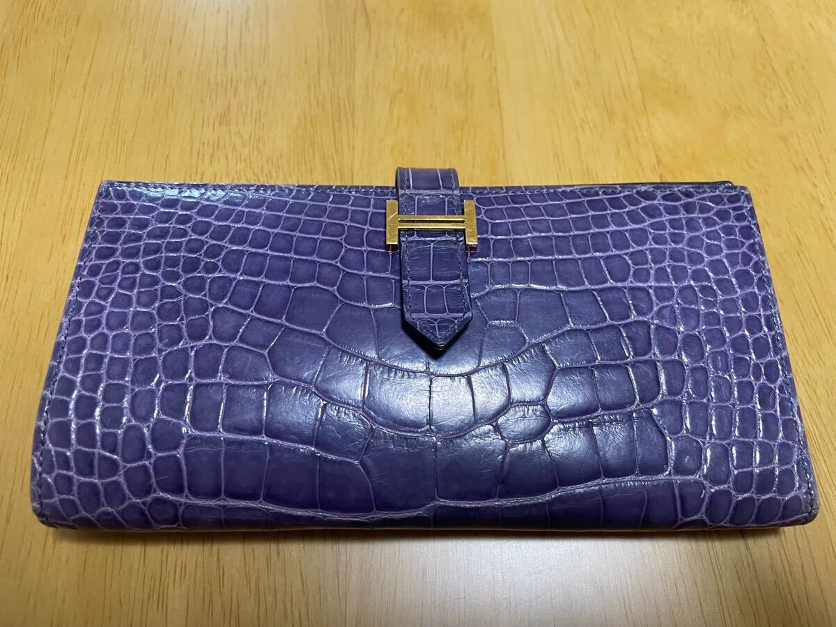 - エルメス HERMES ベアン スフレ アリゲーター クロコダイル パープル 長財布 ゴールド金具