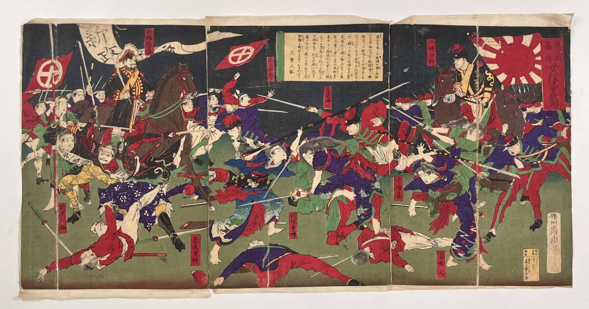 - 61110YN●浮世絵●真作『鹿児島暴徒女隊勇戦図』3枚 楊洲周延 西南戦争 明治10年 西郷隆盛 前原一格●木版画 錦絵