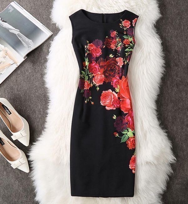 - ワンピース ノースリーブ タイト 膝丈 花柄 黒 通勤 エレガント 大人 レディース ドレス セクシーDJ1801