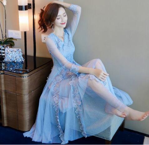 - 春新品 ブルー レース シフォン長袖 ロングワンピース YWQ1402
