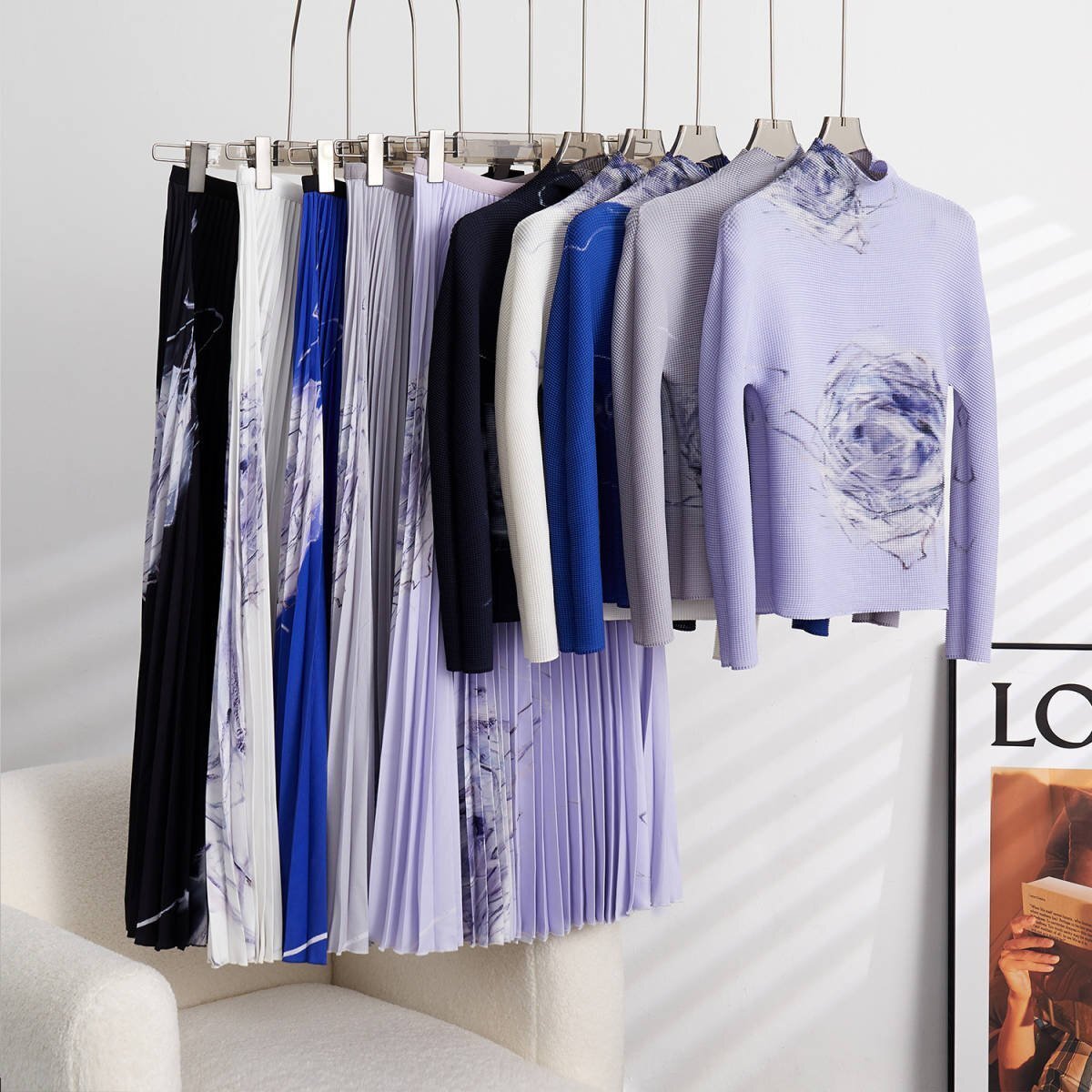 > 送料無料 レディースプリーツシャツスカート2点セットプリーツロングスカート長袖ブラウス弾力がありドレープ性いい 素敵薔薇柄ブラック