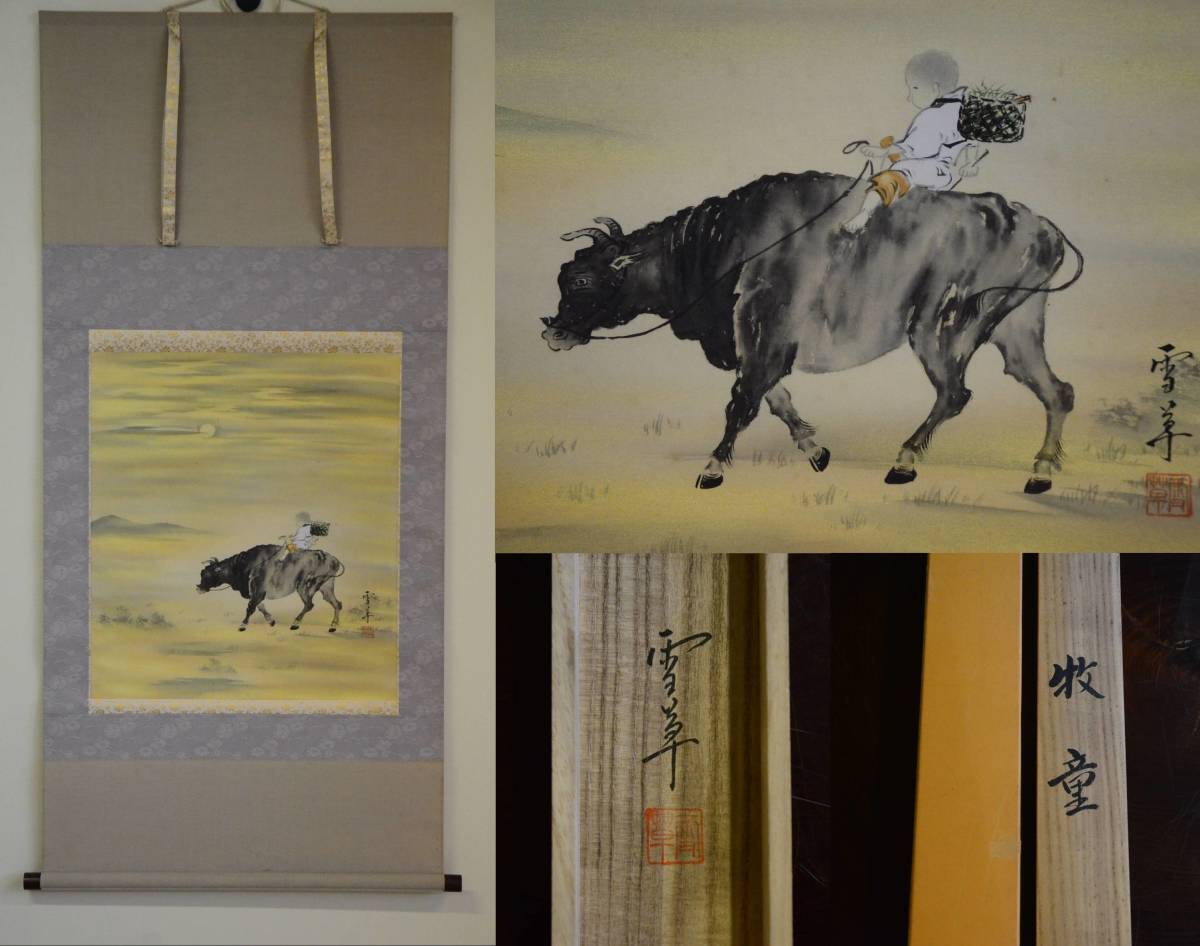 野村雪草 「牧童」 掛軸 日本画 絹本 共箱 古美術