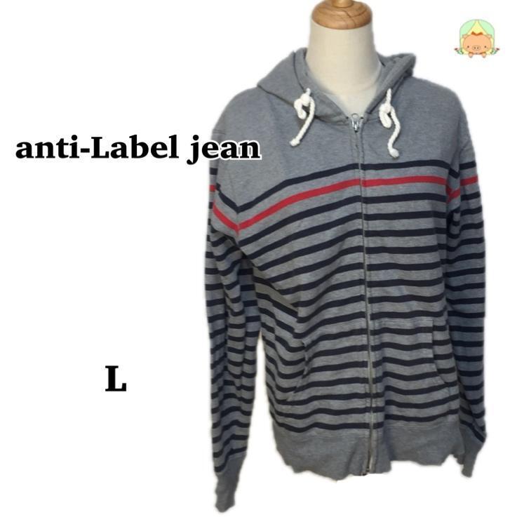 > m0074 パーカー フード付き ボーダー グレー コットン しまむら カジュアル 長袖 【L】