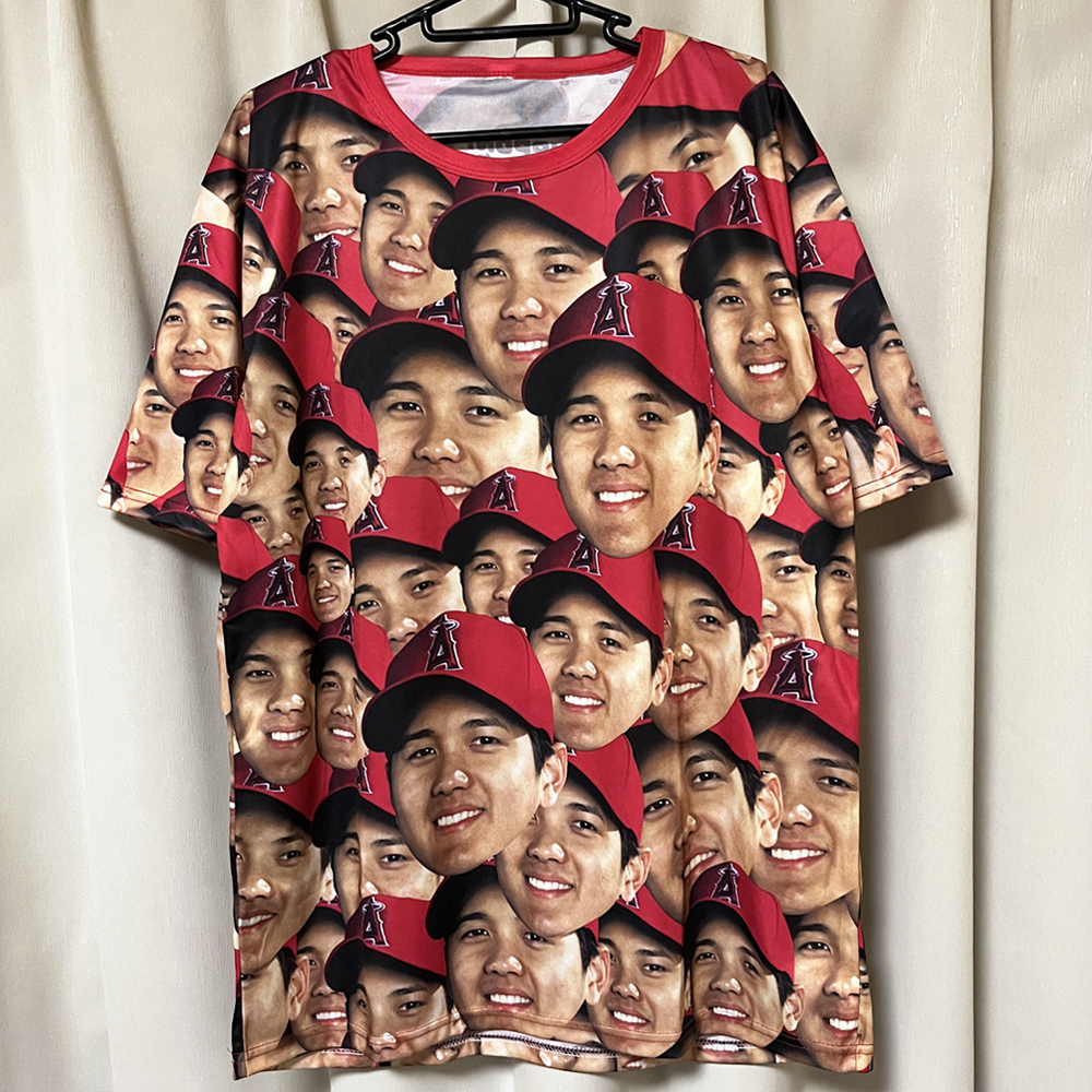 > XL 本物 非売品 大谷翔平 エンゼルス 顔だらけTシャツ レア 球場配布 限定 総柄 MLB ユニフォーム ピクチャー フォト 中古 古着 ドジャース