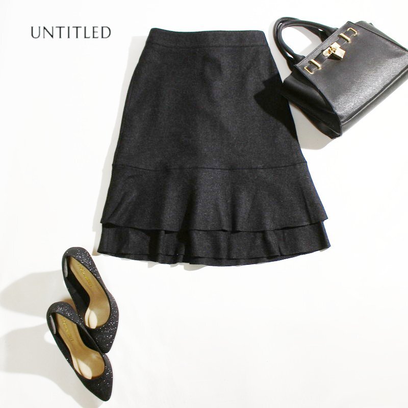 - 美品 アンタイトル UNTITLED 株) ワールド 冬 あったか 毛 アンゴラ ウールスカート 1 ダークグレー 黒 ウールメルトン ウールジャージ―