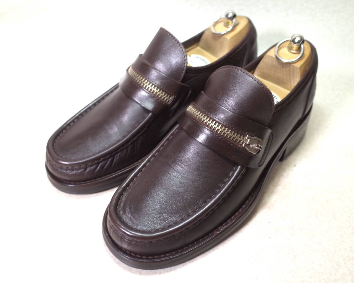 サドル部にファスナーが配されたモックトゥ ローファー/スリッポン レザーシューズ。(ファスナーのスライダーが有りませんが、元々付属していないのか、外されているか不明です。)