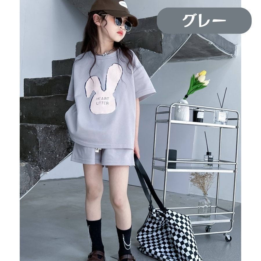 - グレー 90cm セットアップ 上下セット うさぎ 半袖 ハーフパンツ ゆったり ガールズ ダンス服 女の子 夏 韓国子供服