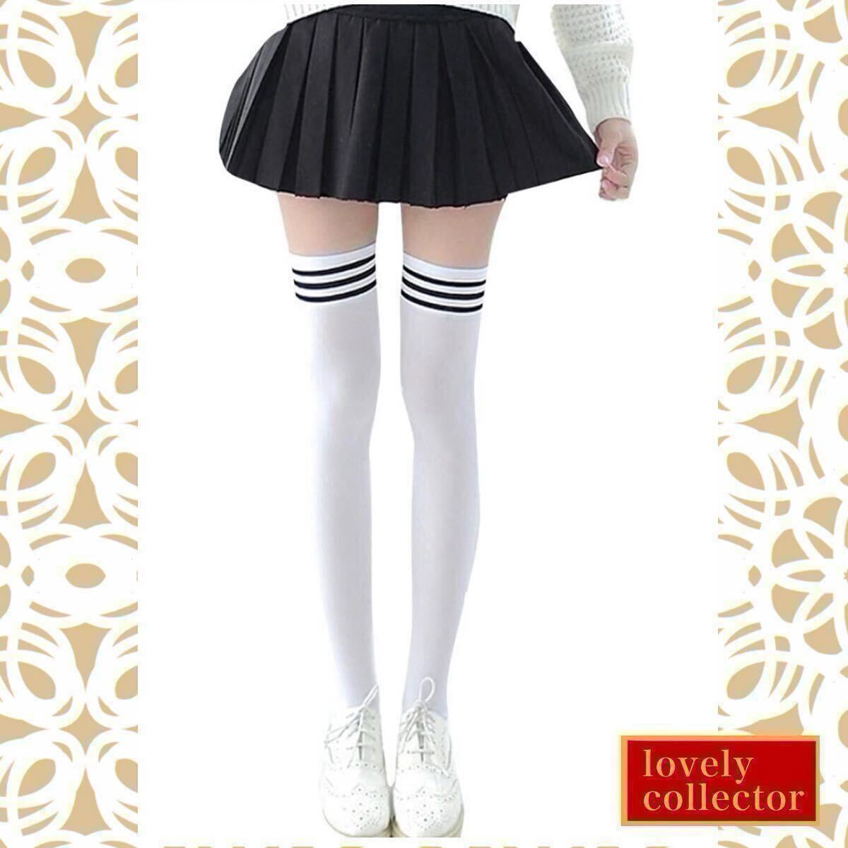 - オーバーニーソックス 美脚 3本ライン 白 ホワイト フリーサイズ