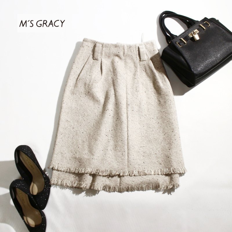 > 美品 厚手 M'S GRACY エムズグレィシー 冬 真冬 可愛い ふんわり Aライン ミックス ウールスカート 9号 38 ベージュ 台形 フリンジ