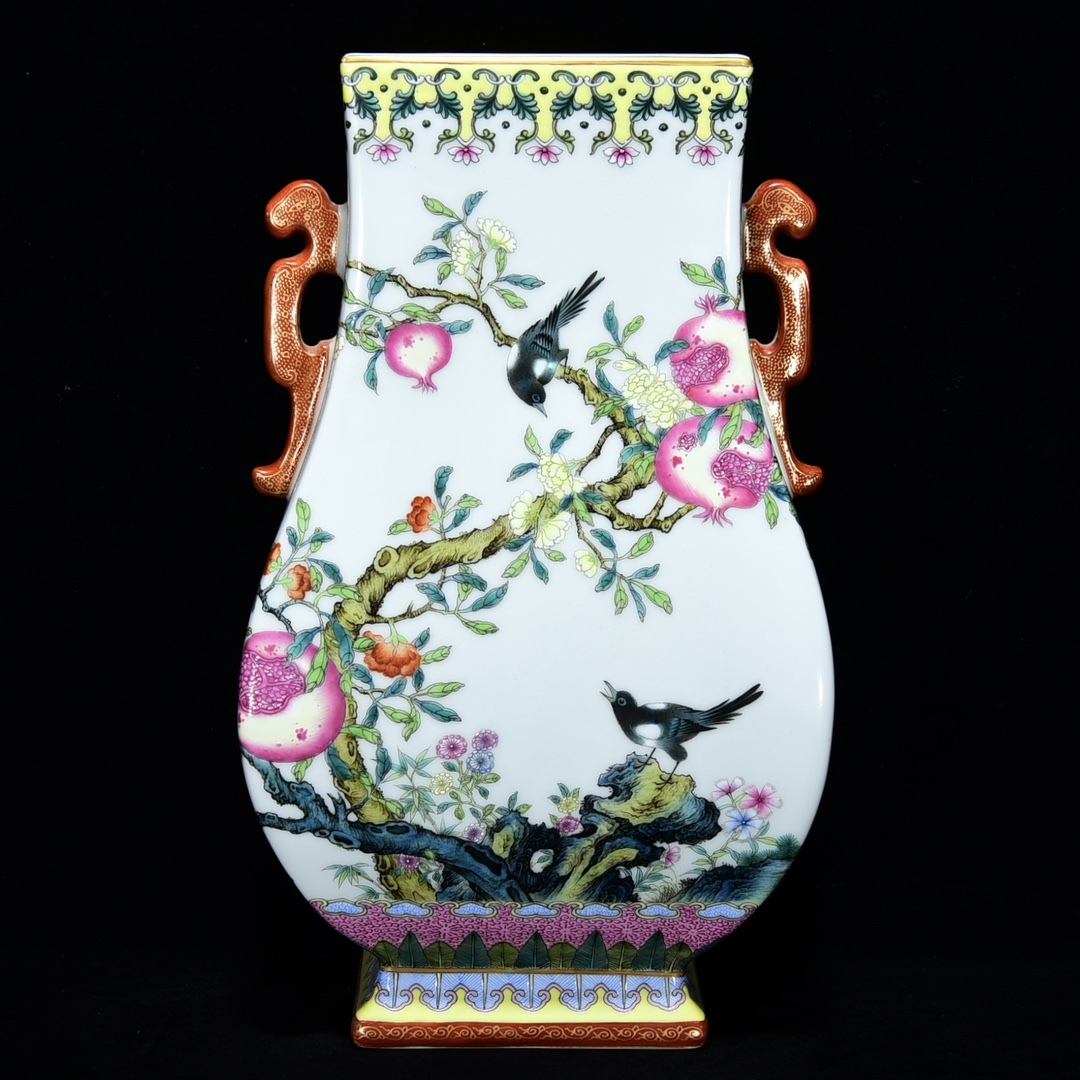- ◆旧家蔵出◆古美術 中国古玩 大清乾隆年製款 粉彩 描金 花鳥 石榴紋双耳扁瓶 古賞物 骨董 時代物 A06