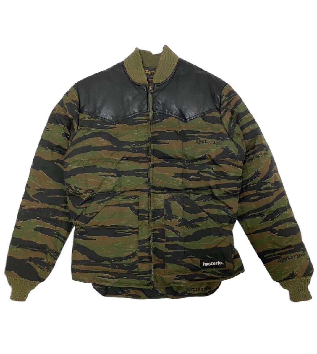 > ■ HYSTERIC GLAMOUR ヒステリックグラマー ■ タイガーカモ 迷彩柄 ヨーク部分 本革 レザー 牛革 切替 ダウンジャケット FREE