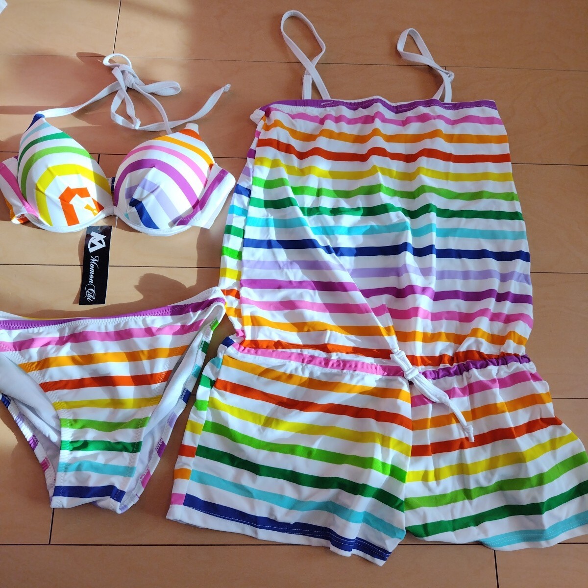 - 水着 ビキニ 緑 ボーダー 3点セット ショートパンツスタイル 新品未使用タグ付き レディース 可愛い フェミニン レインボー
