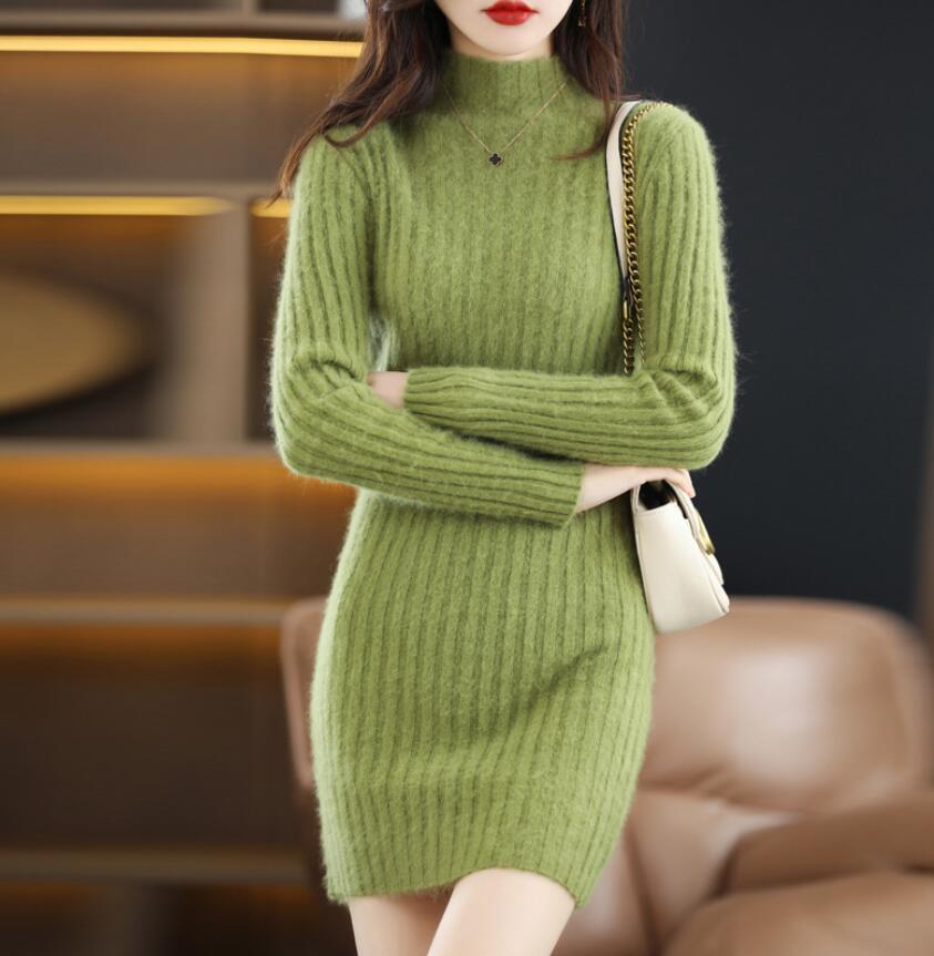 - 秋冬 * ニットワンピース レディース きれいめ 長袖ワンピース ミニ丈 柔らかい 暖かい 大人セーター 着やせ ミニニットワンピース * 緑
