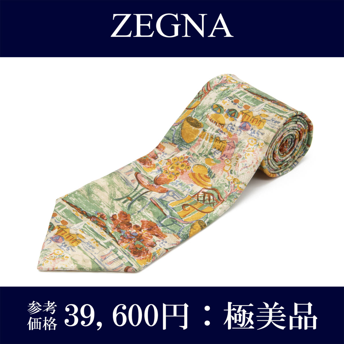 > 送料無料 ゼニア ネクタイ ワイドタイ シルク 黄色 イエロー 緑色 グリーン オレンジ ブランド ティータイム イタリア製 レア 綺麗 N497