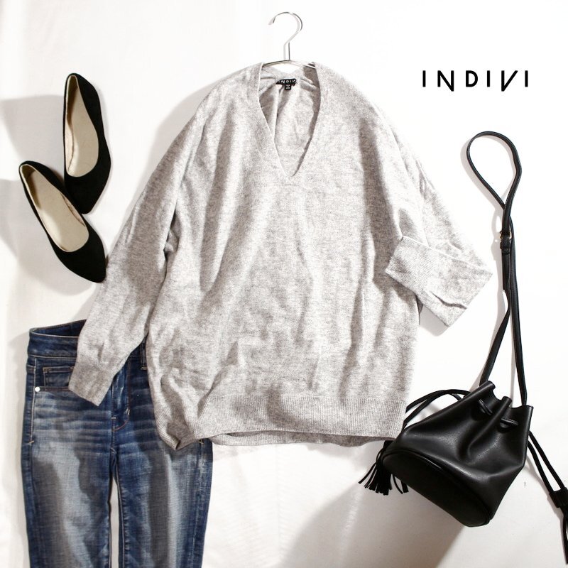- 美品 インディヴィ INDIVI 株) ワールド 冬 ゆったり Vネック カシミヤタッチ ニットセーター 38 9号 まだら グレー ミセス 綺麗め