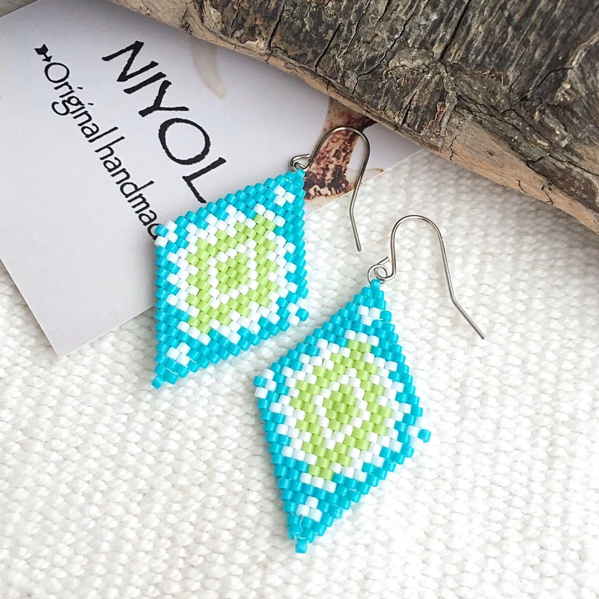 > No.158 ネイティブ柄 ハンドメイドピアス ターコイズブルー ビーズ サージカルステンレスピアス 樹脂ピアス イヤリング オルテガ柄