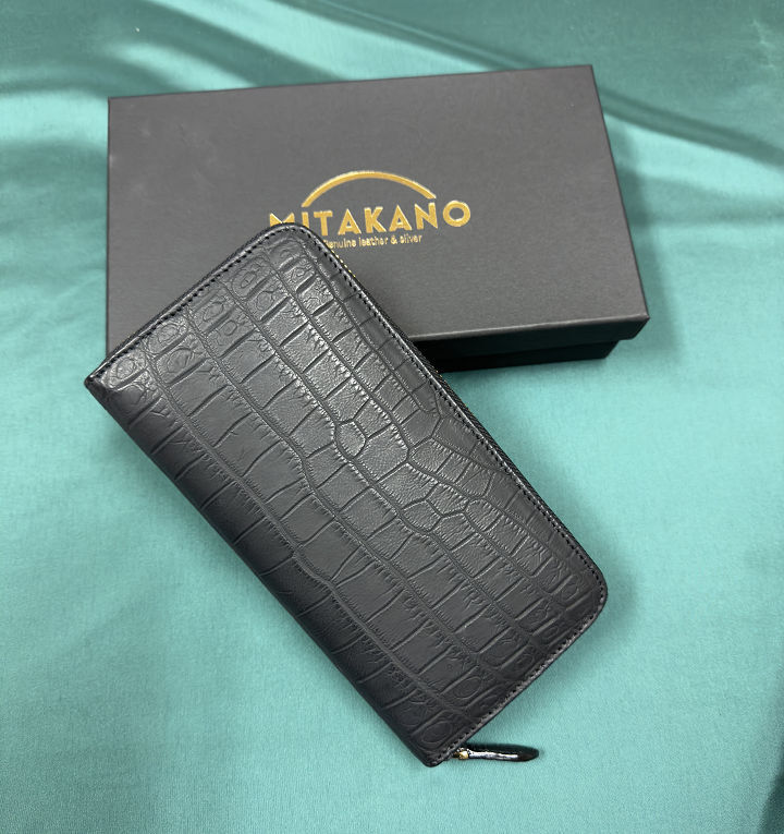 - クロコダイル 一枚革 ラウンド長財布 最高級本革 長財布 ラウンドファスナー ワニ本革 腹革 センター割 黒色 マット仕上げ 本物保証