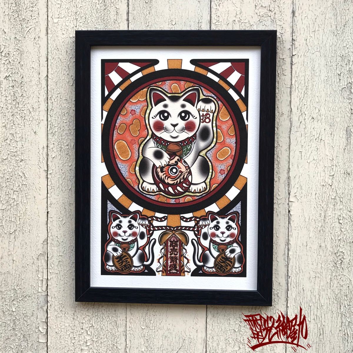 - 縁起物 開運 招福 運気アップ 商売繁盛 小判 お札 招き猫 達磨 A4サイズ 黒色 壁掛け フレーム付き インテリア 尾九 オリジナル イラスト