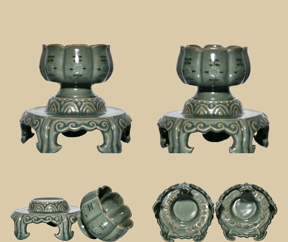 > ▼渡鶴羽▼P413『朝鮮時代旧蔵』朝鮮古陶 朝鮮古美術 高麗磁 古高麗 李朝 高麗青磁青磁象嵌盞托一対