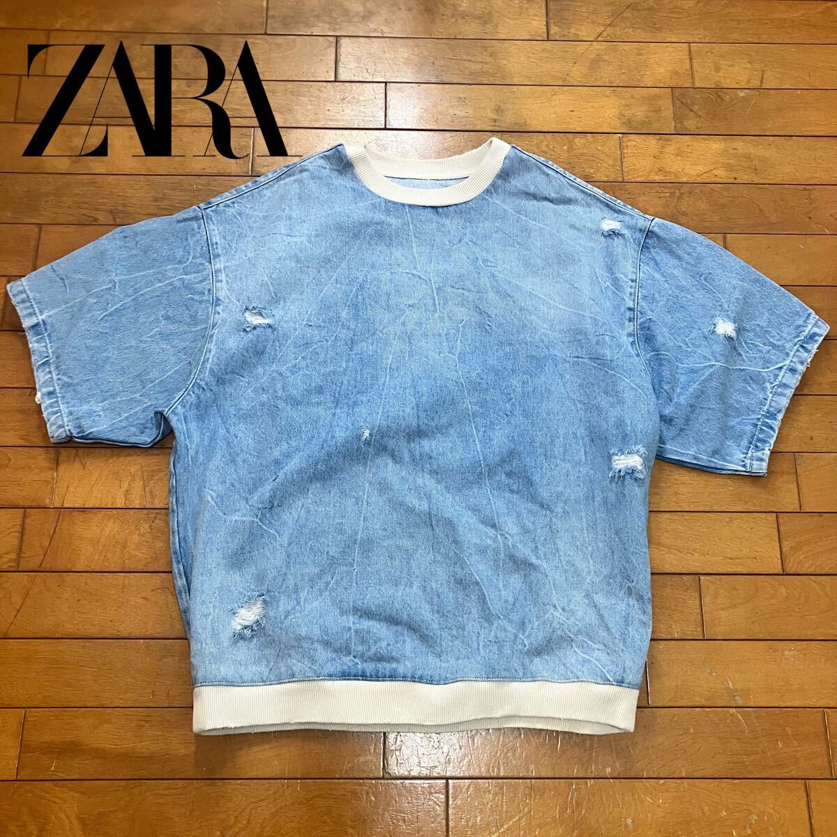 - ☆【 ZARA 】☆ ヘビーコットンウォッシュデニム ダメージTシャツ★サイズUS M