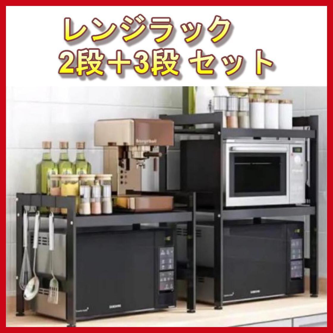 - 【新品即納送料無料】伸縮式電子レンジラック2段式+3段式のお得な2点セット◆調味料ラック/電子レンジ台/レンジ上ラック/キッチンラック